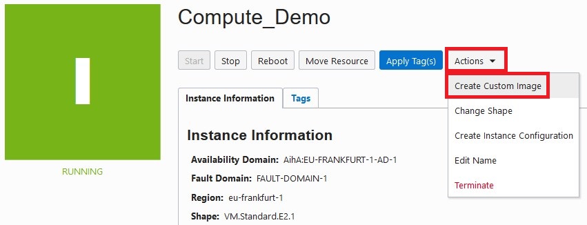 From the Compute Instance Details page click on “Actions”, “Create Custom Image”.