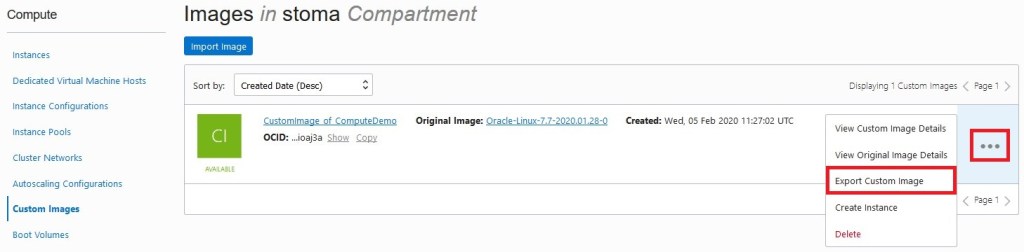 From the menu on the top right side, click on “Compute”, “Custom Images”. Then from the Images Details side, click on the menu on the right and then on “Export Custom Image”. Select a bucket from the drop-down menu and click “Export Custom Image”.