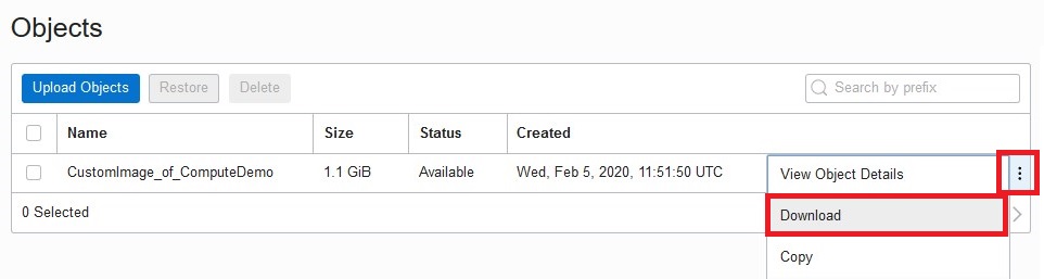 From the Bucket Details Page click on the menu on the right side and then on “Download”.