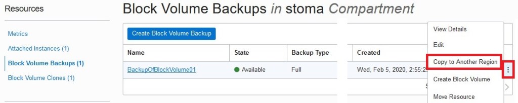 After the Block Volume Backup has been created, click on “Copy to Another Region” from the right-side menu.