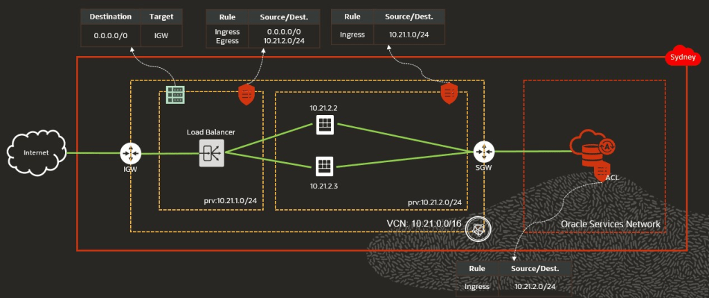In all examples we were using statefull security list rules. If you are concerned about high levels of network traffic coming to your VCN, consider using stateless security list rules to limit the level of connection tracking your VCN must perform.
