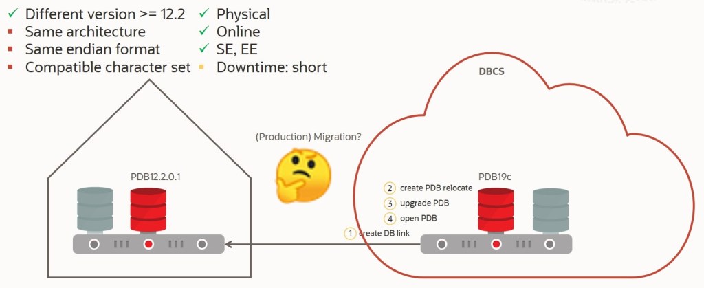 - On the target CDB in the Cloud, run the CREATE PLUGGABLE DATABASE … FROM … RELOCATE SQL command to move the PDB from on-premise to the cloud.