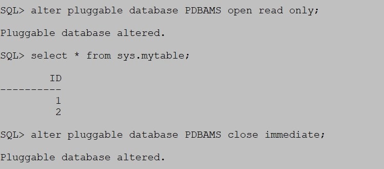 Open it in READ ONLY mode and verify that the test table exists containing one row. Close the PDB again.