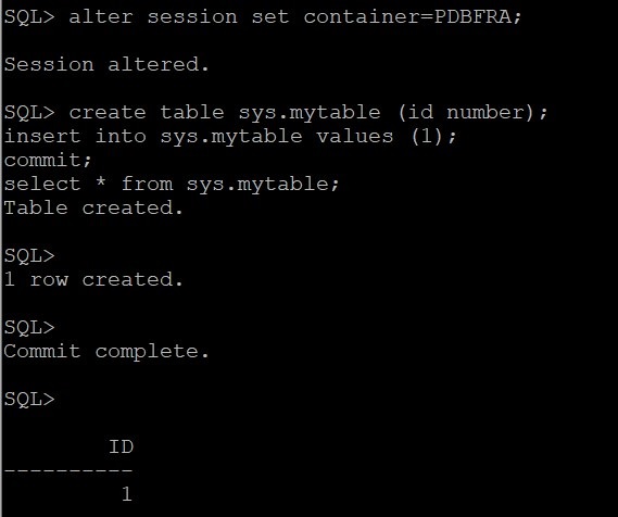 Step 5: on server1 in PDBFRA. Create a test table and insert one row into it.