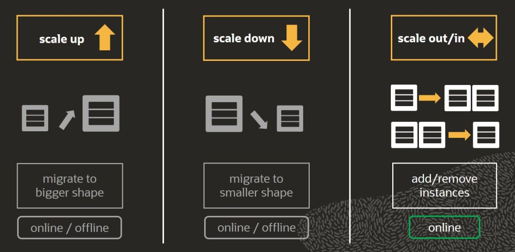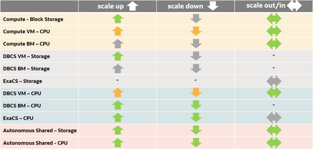 Scaling capabilities in Oracle Cloud Infrastructure allows you to add and remove resources as needed, manually or automatically, to different services like storage, compute, and databases. The following table provides an overview of the available options (green=online, yellow=offline, gray=migration):