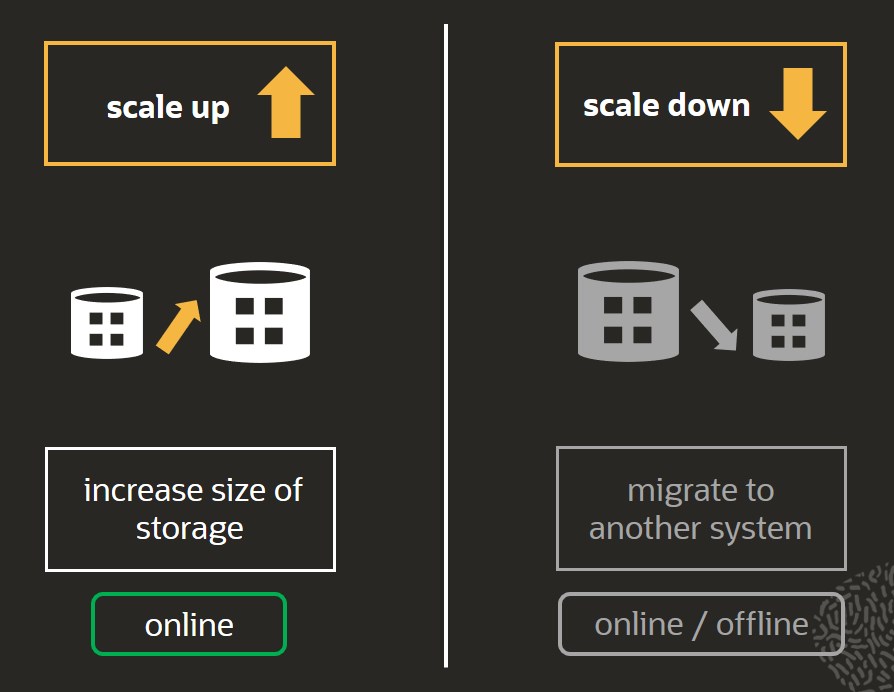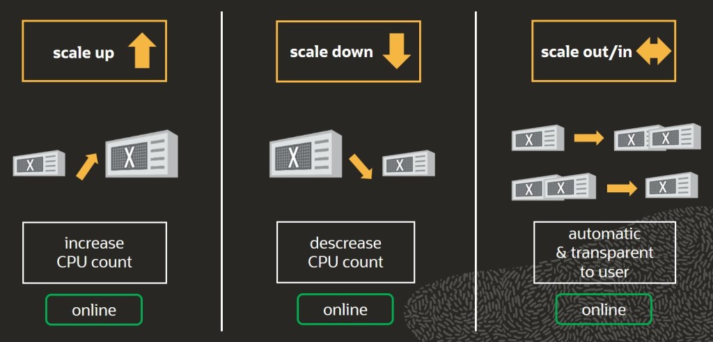 Scale out/in: Autonomous database is based on Exadata Infrastructure. Additional storage servers will be used if needed transparently to the user.