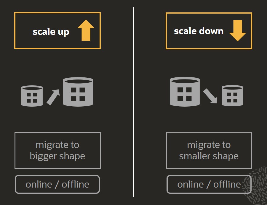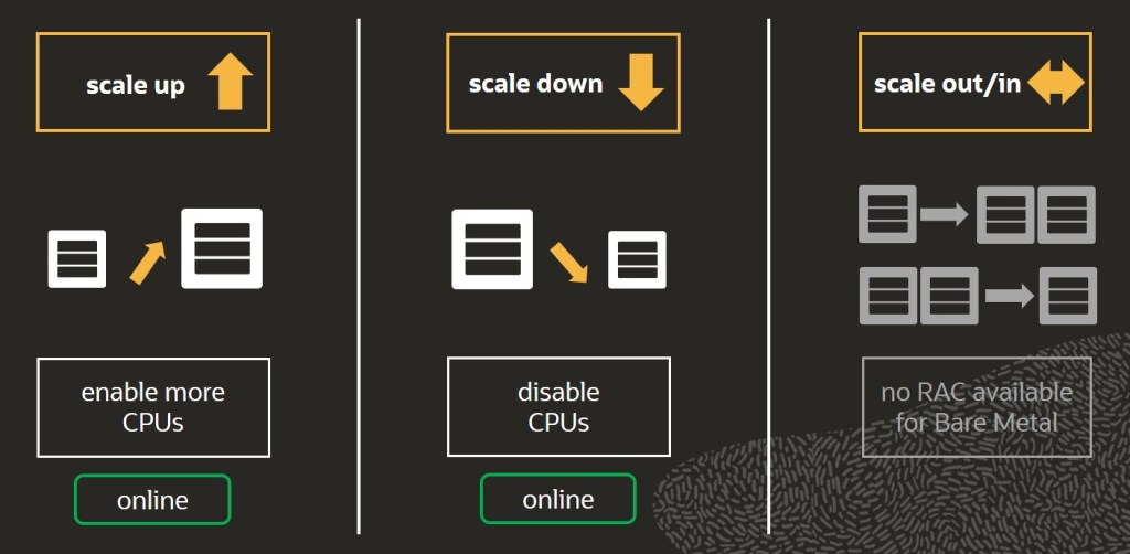 Scale up/down: to increase or decrease the processing power to a bare metal DB system, change the number of enabled CPU cores in the system without impacting the availability of that system.