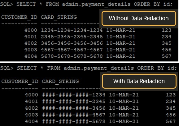 Oracle Data Redaction enables you to mask (redact) data that is returned from queries issued by applications at runtime. Data itself is not changed! Common use cases are redaction of credit card numbers, personal IDs, and birth dates to comply with industry regulations such as Payment Card Industry Data Security Standard (PCI DSS) and the Sarbanes-Oxley Act. Policies for data redaction can be implemented by the customer using DBMS_REDACT PL/SQL Package.