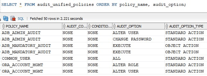 Database Auditing enables selective and effective auditing inside the Oracle database using policies and conditions. Predefined policies are activated by default to monitor any abnormal activity. Additional audit policies can be configured to audit based on specific IP addresses, programs, time periods, or connection types. It is enabled by default and can NOT be disabled.