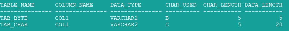 As we see, the data length (last column in our query) is 5, regardless of BYTE or CHAR length semantic.