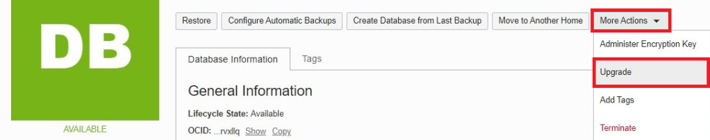 oci db database upgrade-with-db-home --database-id $DATABASE_OCID --db-home-id $DB_HOME_OCID --action UPGRADE