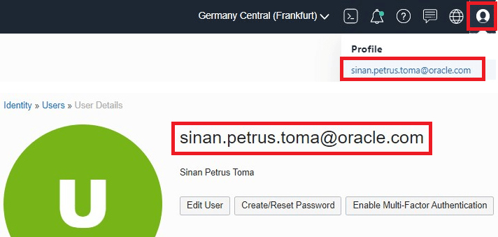 Click on the Profile icon on the upper right side of your web browser, then on your user name. Notice your user name. If the user is an Identity Cloud Service Provider (IDCS) user, then the IDCS name will be part of your user name.