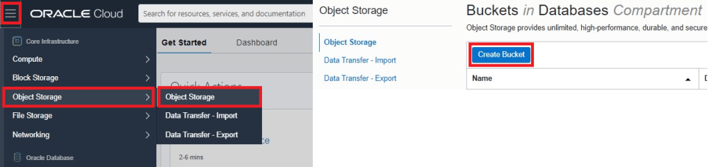 On the web console, click the navigation menu in the upper left side and select Object Storage > Object Storage. Click on Create Bucket, enter a bucket name, and click Create.