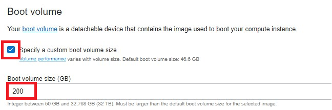 For this blog post, I’ll continue with the manual installation to go through the steps in case you want to install it manually. In the web console, click the navigation menu on the upper left side and select Compute > Instances. Click on Create Instance. I’ll choose the name “zdmhost” and Oracle Linux 7.9. Click on “Specify a custom boot volume size” and put 200 GB as the boot volume size. With that we will have the required 100 GB of free space: