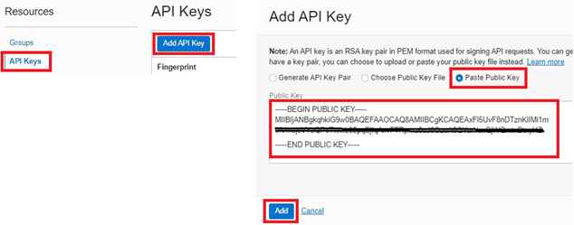 Upload the PEM public key in the Console. From your user’s page, click on API Keys and Add API Key. Select Paste Public Key, paste the output from the previous command, and click Add.