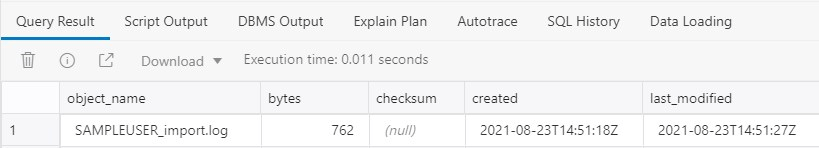 Now you will see that the SAMPLEUSER_import.log file was created. As we don’t have access to the file system, we will need to copy the log file to Object Storage first using the PUT_OBJECT procedure, and then download it from there: