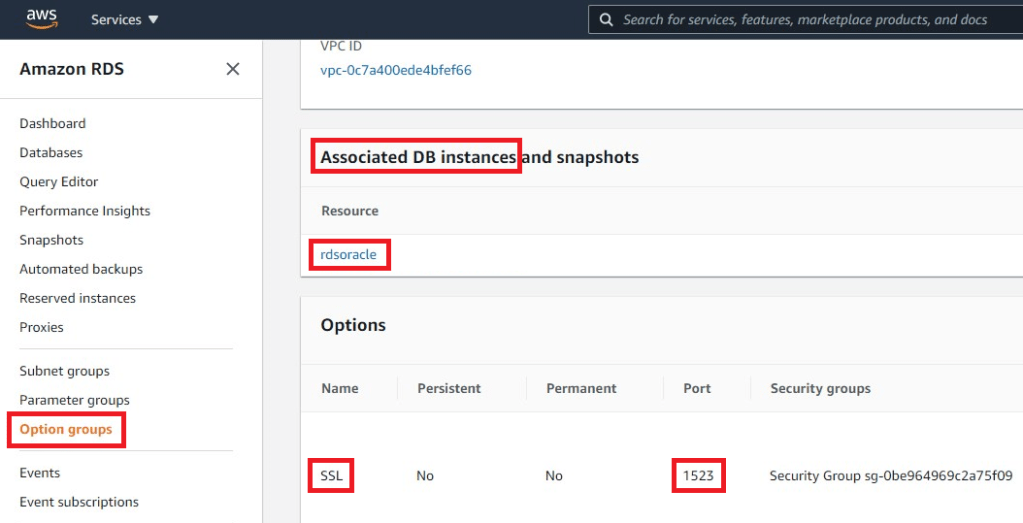 Follow the AWS documentation to enable secure connections to your RDS Oracle database using SSL/TLS. I have created a new option group, added the Oracle SSL option to it, and associated the option group with the RDS Oracle instance. As Autonomous Database on Shared Infrastructure only supports ports 1521 to 1525 for database links, I will use port 1523 here.