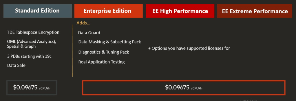 For EE, it becomes a bit tricky. As all Editions have the same pricing ($0.09675 vCPU/h), it doesn’t matter what edition to choose from the pricing perspective. At the end of the day, you are only allowed to use database options you have supported licenses for.