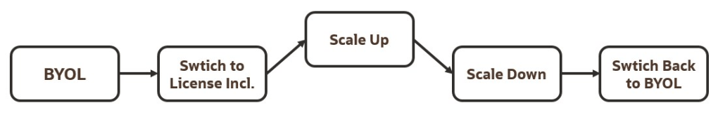 It is possible to switch from License Included to BYOL and vice versa without downtime. For example, you are using BYOL, but need more OCPUs for a specif period of time that you cannot cover with your existing licenses, then you switch to License Included, scale-up (without downtime in Autonomous and Exadata Cloud Services), use more resources, scale down when not needed anymore, and finally switch back to BYOL.