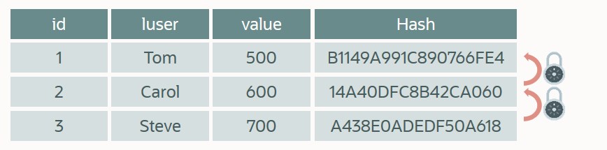 SQL> SELECT id, luser, value, ORABCTAB_HASH$ FROM bank_ledger;