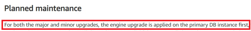 Keep in mind that planned maintenance in AWS RDS means downtime! Whether applying Release Updates (RUs) or upgrading to a major release, the primary database is not available: