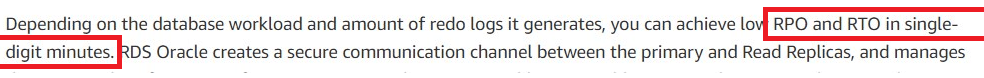 These wait times all count towards RTO, not talking about the time needed until the DBA is notified about a failure, logs in to the system, does some analysis, and decides to promote a Read Replica. RTO will very probably be more than just “single-digit minutes”.