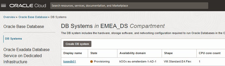 After the network connection is established, the VM DB System will be created. You can see the database in Provisioning status in the ODSA portal: