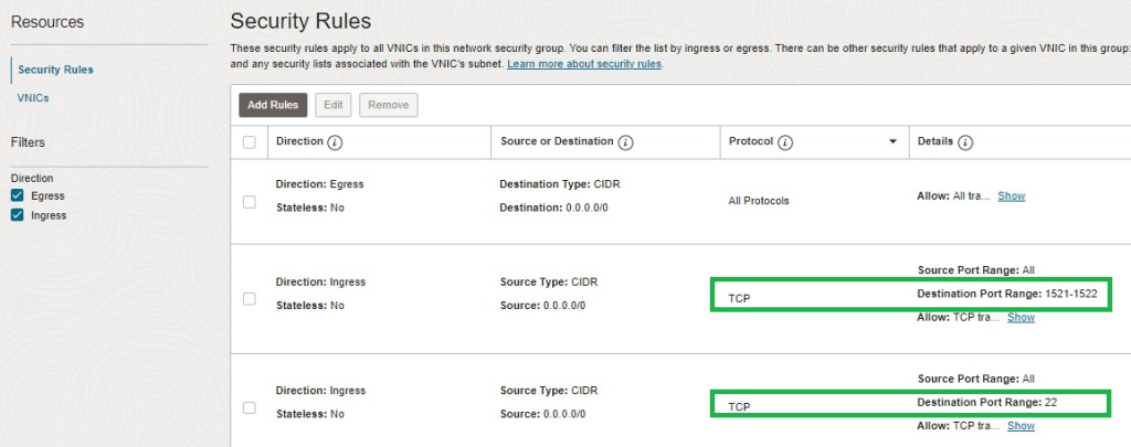 and already contains the Ingress and Egress rules for TCP port 22 (SSH) and TCP port 1521 (SQL*Net):