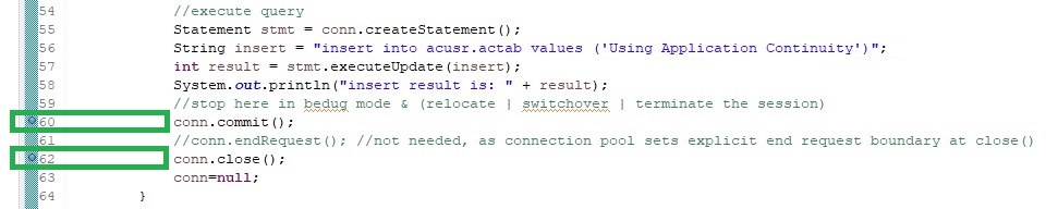 The Java code provided is an example to get you started using Oracle Application Continuity with Java. For production implementations, please follow the instructions and recommendations provided by Oracle.