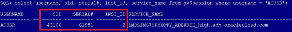SQL> select username, sid, serial#, inst_id, service_name from gv$session where username = 'ACUSR';