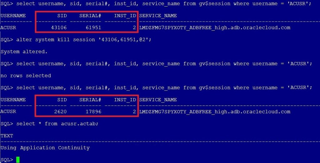 SQL> exec DBMS_APP_CONT_ADMIN.SET_DRAINING('lmdzfmg7spyxoty_adbfree_high.adb.oraclecloud.com', 10, 'IMMEDIATE');