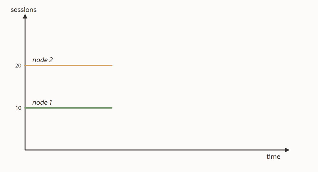 During normal operation, both RAC nodes are up and running and serving the application. Depending on your load-balancing strategy the number of sessions might be different or equally distributed across both nodes. For a better visualization of the diagram below let’s assume having 10 sessions on node 1 and 20 sessions on node 2:
