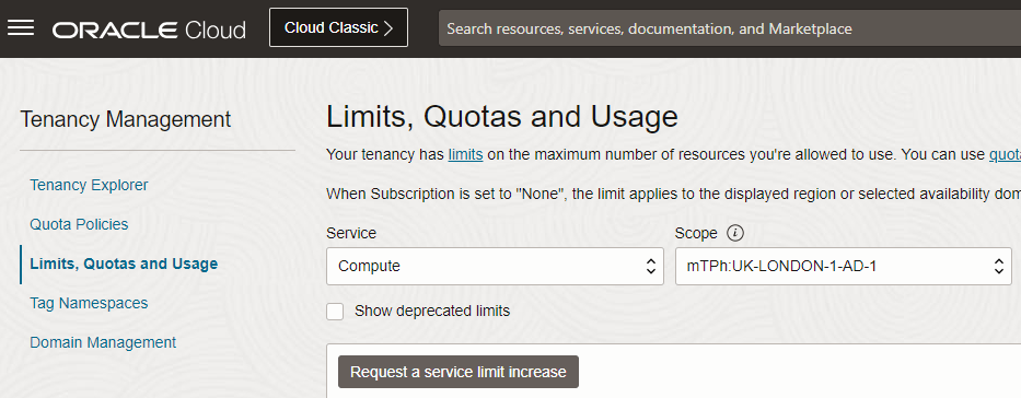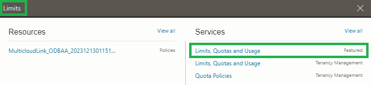 In the OCI Console, search for “Limtis” and click on “Limits, Quotas and Usage”: